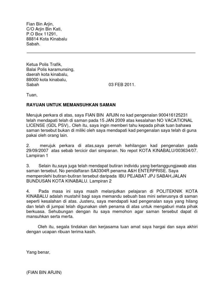 Contoh Surat Rayuan Saman Jpj Kumpulan Contoh Terbaru